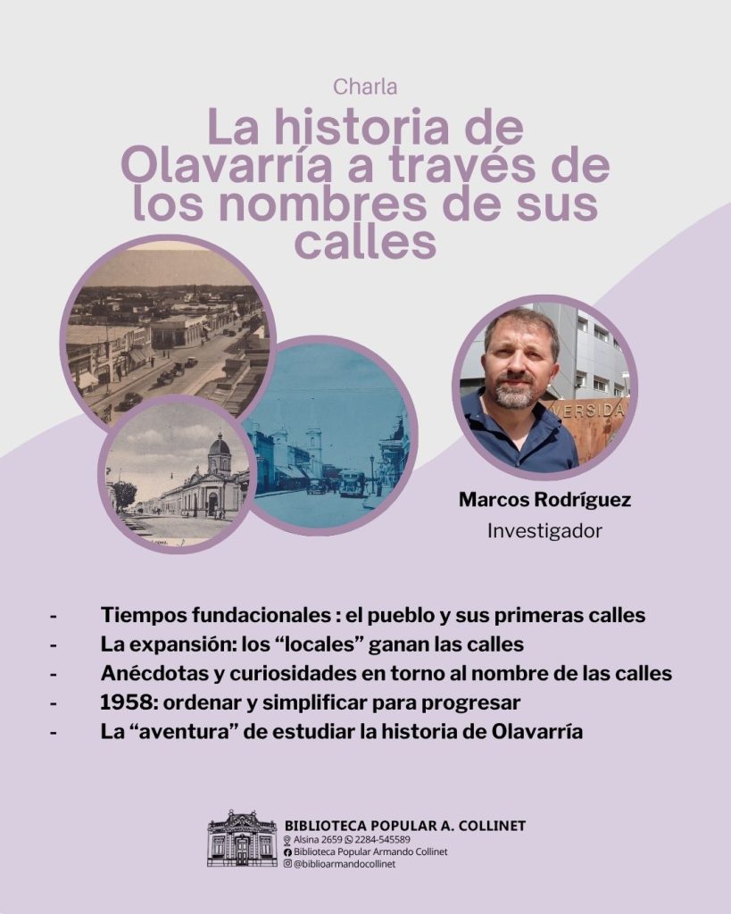 La Biblioteca Popular Armando Collinet invita a la comunidad a la charla “La historia de Olavarría a través de los nombres de sus calles”. El evento es con entrada libre y gratuita y se desarrollará el viernes 24 de abril a las 19 horas en Alsina 2659.